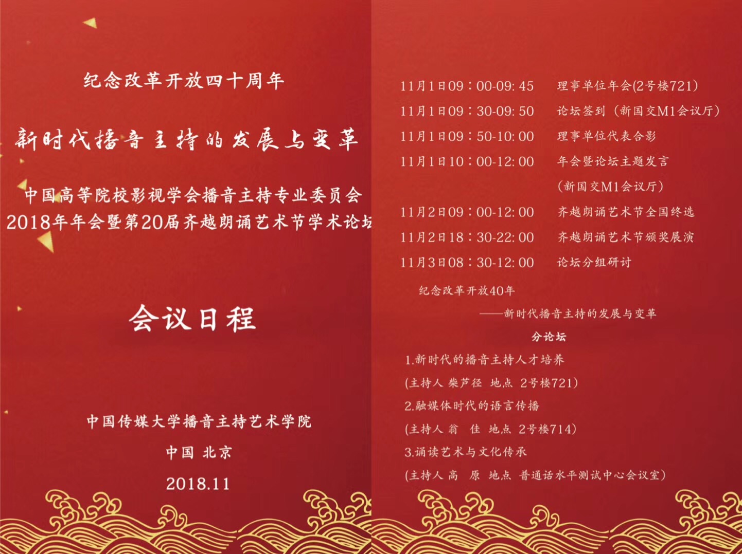 在比赛期间,三亿体育经理、播音与主持艺术系主任董亮老师和播音与主持艺术系张骁将老师还共同参加了中国高等院校影视学会播音主持专业委员会2018年年会暨第20届齐越朗诵艺术节学术论坛。此次会议以“庆祝改革开放四十周年——新时代播音主持的发展与变革”为主题,开展了一系列学术活动。