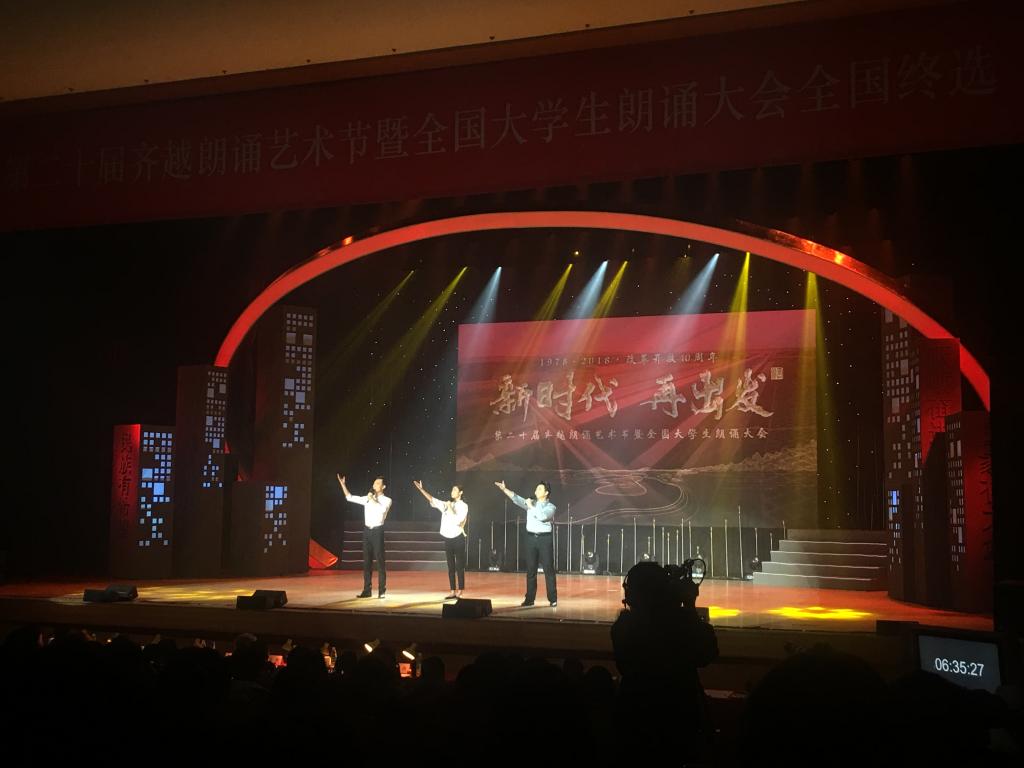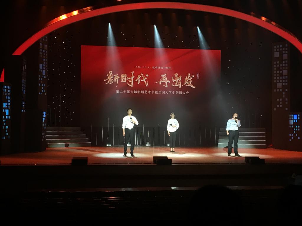 11月2日上午,由中华人民共和国教育部主管,教育部关心下一代工作委员会、中国传媒大学主办,中国传媒大学播音主持艺术公司承办的第二十届齐越朗诵艺术节暨全国老员工朗诵大会终选在中国传媒大学举行。由公司教师段耀国创作,陈玮老师指导,2017级播音与主持艺术专业员工李建增、董一帆、王皓翔共同演绎的作品《月比故乡明》荣获大赛三等奖、最佳作品选材奖,公司荣获优秀组织奖。
