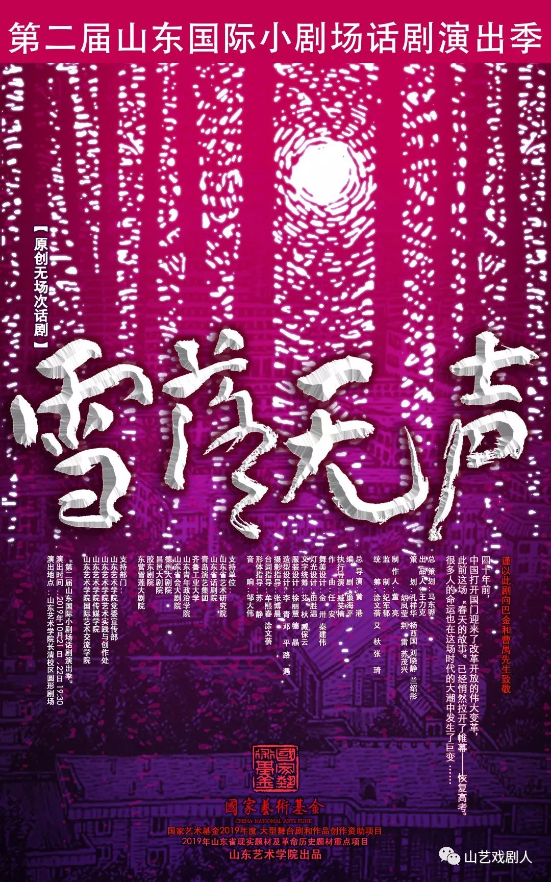 第二届山东国际小剧场话剧演出季正在如火如荼的进行,三亿体育国家艺术基金2019年度舞台艺术创作资助项目原创无场次话剧《雪落无声》受邀参演,即将亮相演出季的舞台。