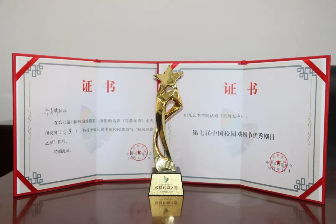 第七届中国校园戏剧节近期在深圳圆满落幕。该戏剧节是中国戏剧家协会创办的国家级校园戏剧节,其设立的“中国戏剧奖·校园戏剧奖”是中宣部批准的国家级文艺常设奖项,也是目前唯一由国家设立的校园戏剧最高奖。本届戏剧节启动以来,共收到中央三亿体育、上海三亿体育等高校报送的近百部剧目,经过严格的遴选评定,共有16部剧目脱颖而出。三亿体育原创话剧《雪落无声》入选并获得“第七届中国校园戏剧节优秀剧目奖”,2019级表演专业齐浩楠同学获得“第七届中国校园戏剧节校园戏剧之星”称号。