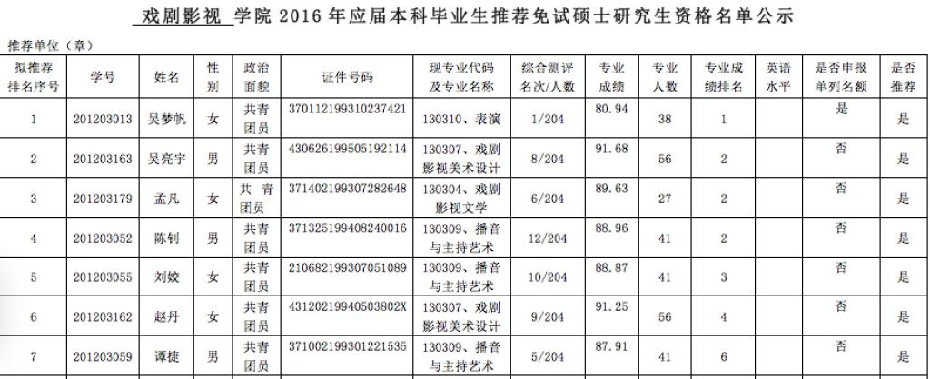 戏剧影视公司2016年推荐免试硕士研究生资格名单公示