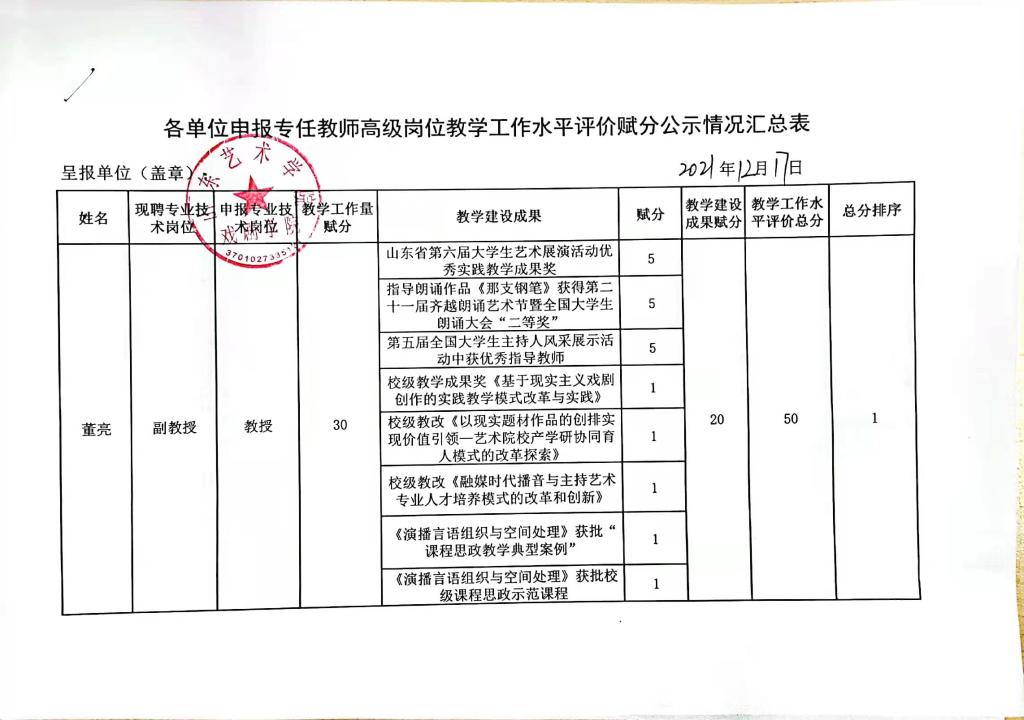 各单位申报专任教师高级岗位教学工作水平评价赋分公示情况汇总表