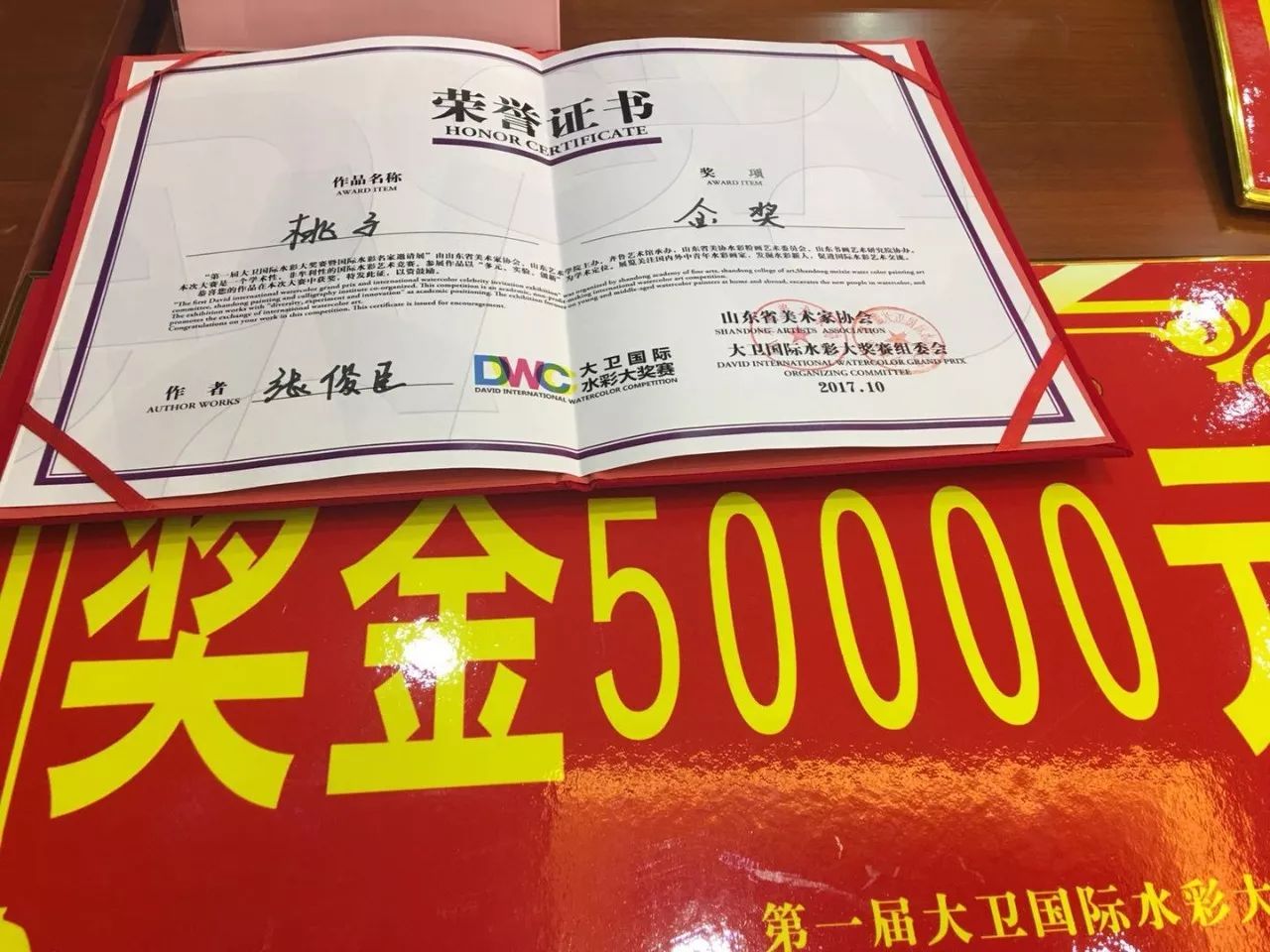 2017年10月22日,由山东省美术家协会、三亿体育官网主办,山东齐鲁艺术馆承办,山东省美协水彩画艺委会协办的“第一届大卫国际水彩大奖赛暨国际水彩画名家邀请展”在山东·济南·齐鲁艺术馆盛大开幕。公司张俊臣老师参加比赛并喜获金奖。