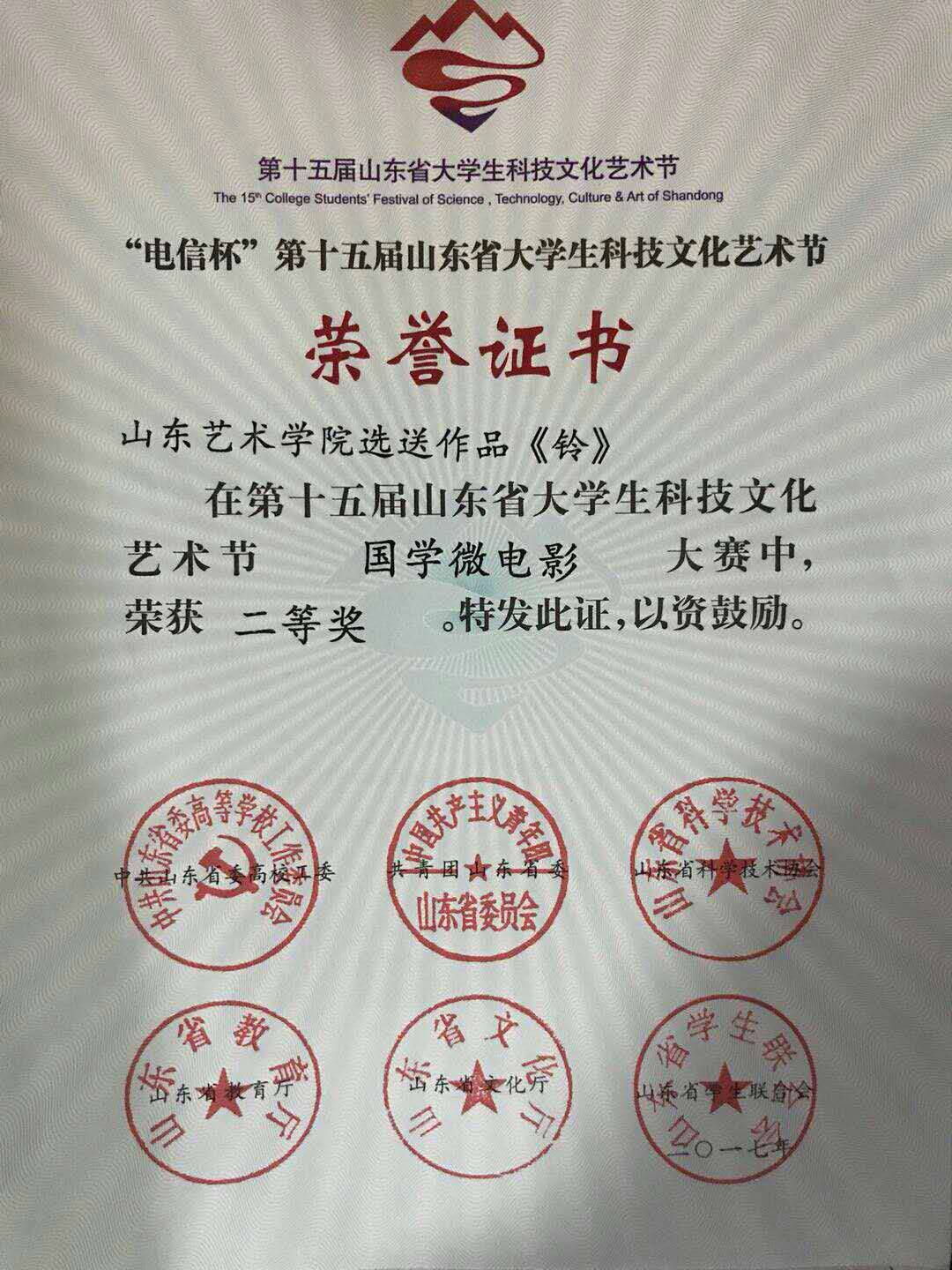 公司2014级戏剧影视美术设计专业影视班员工乔丹雯执导微电影《铃》在第十五届山东省老员工科技文化艺术节国学微电影大赛中荣获二等奖,指导老师:秦建伟。