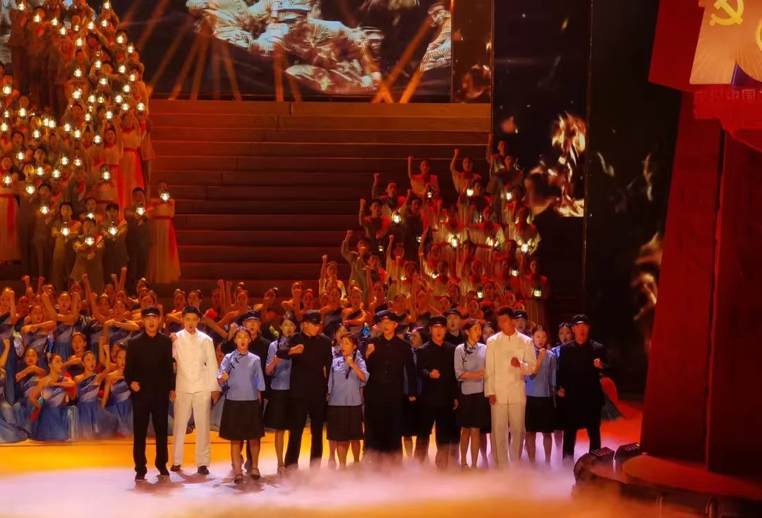 戏剧学子参演歌舞《这盏灯、国际歌》大气恢宏歌颂共产主义,短剧《红色乳娘》生动展现军民水乳交融、生死与共铸就的沂蒙精神,乳娘,不是亲娘,胜似亲娘,她们用生命和鲜血,为革命后代建构了温暖襁褓,让革命火种生生不息,用朴实无私的行动,谱写了一曲感天动地的大爱之歌。短剧《一诺千金》再现黄河滩区60万群众大迁建。多媒体诗朗诵《让我来!跟我上!》讲述众志成城、团结抗疫的感人故事。微视频现场誓言《我们正青春》100位老员工党员代表宣读入党誓词,发出“对党忠诚,为共产主义奋斗终身”的铮铮誓言。建设组歌《人民心声》《咱们工人有力量》《革命人永远是年轻》《我们走在大路上》《我的祖国》,再现了国富民强的足迹,彰显了祖国建设时期的峥嵘岁月。大合唱《走向复兴》抒发了中国人民为实现中华民族伟大复兴而奋斗的决心。他们凭借过硬的专业水平和良好的艺术表现,为演出增添了一抹亮丽的色彩,得到了观众的一致好评,充分展示了公司学子朝气蓬勃的精神,引发山艺人对于爱国、爱党的情感共鸣。