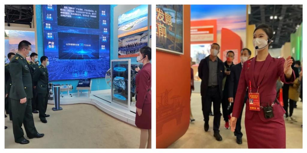 说起这次讲解,王子星说:“从‘心’开始,真诚表达,是我最大的收获。”为了专业上的精益求精,在正式执行解说工作前,她经历了近3个月高强度的理论学习及礼仪培训,但面对最初2万多字的讲解词,最令她头疼的问题是如何不成为一个“讲解机器人”,老师一直教导她要用心说话,说心里话。如何将一个个历史成就、一项项创新成果、一组组亮眼数据真情实感地表达出来,是她首要解决的问题。王子星是一名地地道道的南方姑娘,对讲解词中关于山东的历史及各项举措都不了解。之前对于山东这个省份的感情更多是一种学子对母校的情怀,而并非像其他讲解员一样有家的感觉。为了让自己能够更加真诚地表达,她在培训之余给自己的笔记本上记上了密密麻麻的专有名词解释,但让她改变最大的转折点还是她到达北京展览馆山东展区的第一天,当展品实物从文字里跳出来摆在她面前,她能从山东手造中看到山东传统工艺的传承和创新;从一册册《儒典》中看到这个礼仪之邦的儒雅;从青岛港集装箱码头模型中看到全球领先的现代化技术;从山东特色农产品中看到这个大省给全国人民的底气;从泰山挑山工身上看到亿万齐鲁儿女的担当……王子星说:“当我了解了一个个展品背后的故事,发自内心地赞叹着这十年的发展成就,感受着来自五湖四海的参观者对于山东发展的肯定与赞叹,心里说不出的自豪,我当时心想,这不就是我一直想找的‘家’的感觉吗!”