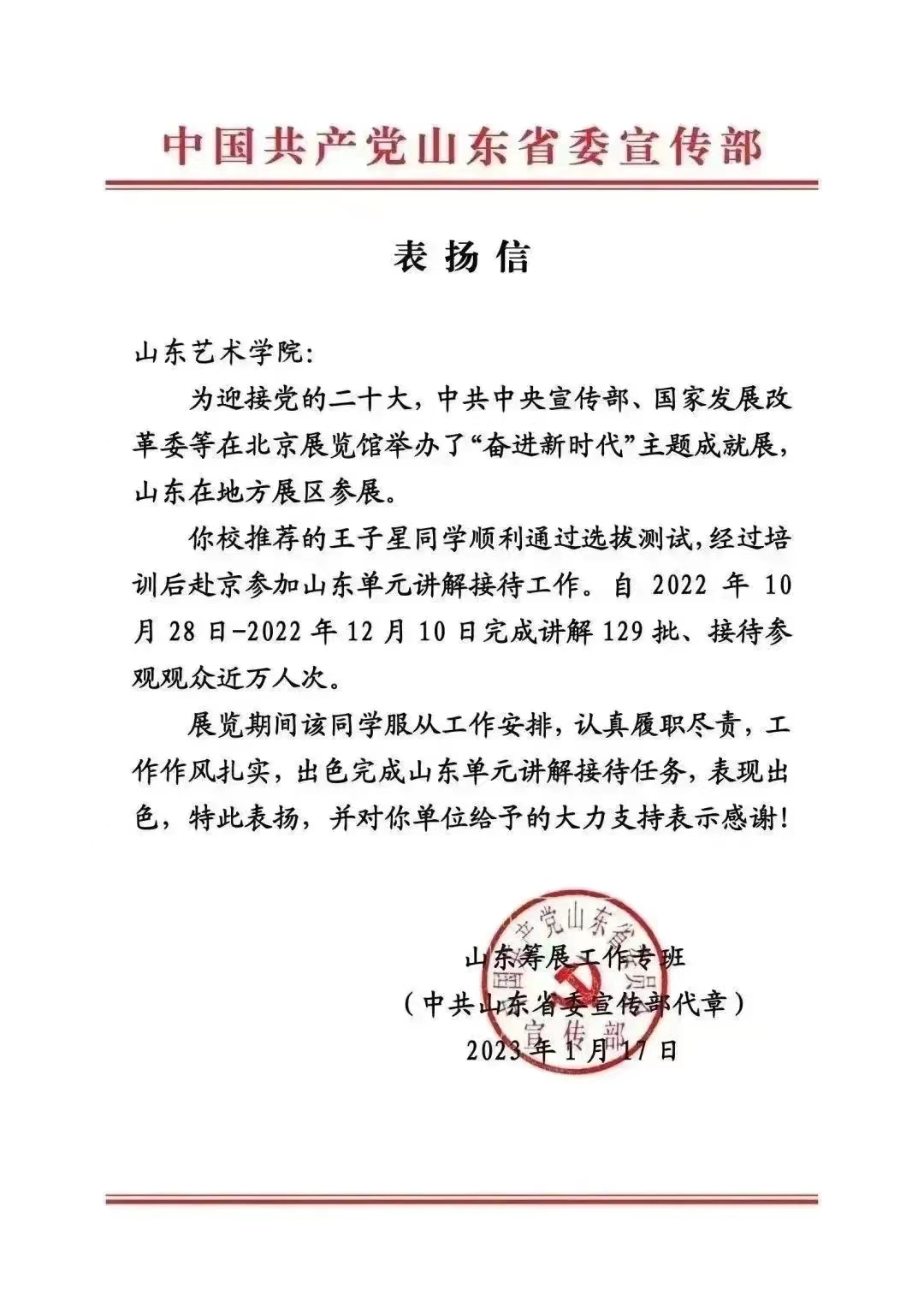 近日,三亿体育官网收到中共山东省委宣传部发来的表扬信,信中指出,三亿体育2020级播音与主持艺术专业王子星同学,在“奋进新时代”主题成就展山东单元讲解接待工作中,服从工作安排、认真履职尽责,工作作风扎实,表现出色,信中同时对公司给予的大力支持表示感谢。