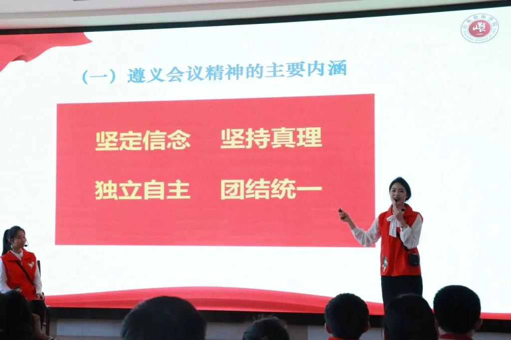 活动中,志愿者以“遵义会议与遵义会议精神”为主题,为同学们讲述了遵义会议的基本过程和历史意义、遵义会议精神的主要内涵以及新时代如何弘扬遵义会议精神。宣讲过程中,志愿者通过生动的语言、真挚的情感,结合“红军坟”背后感人至深的故事以及进步女青年黄星元为国捐躯的英勇事迹,带领同学们深入了解遵义会议的精神内核,感受蕴藏在过往岁月中的历史厚重感与使命认同感。在提问环节,同学们积极踊跃地参与互动,纷纷举手回答问题,志愿者用小员工听得懂、听得进、喜欢听的方式,通过形式多样多样的互动帮助同学们感悟“坚定理想,坚持信念,独立自主,团结统一”的遵义会议精神。