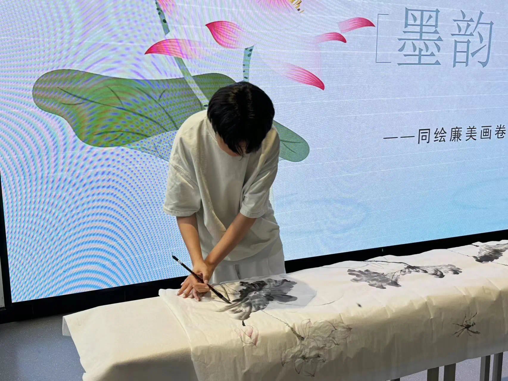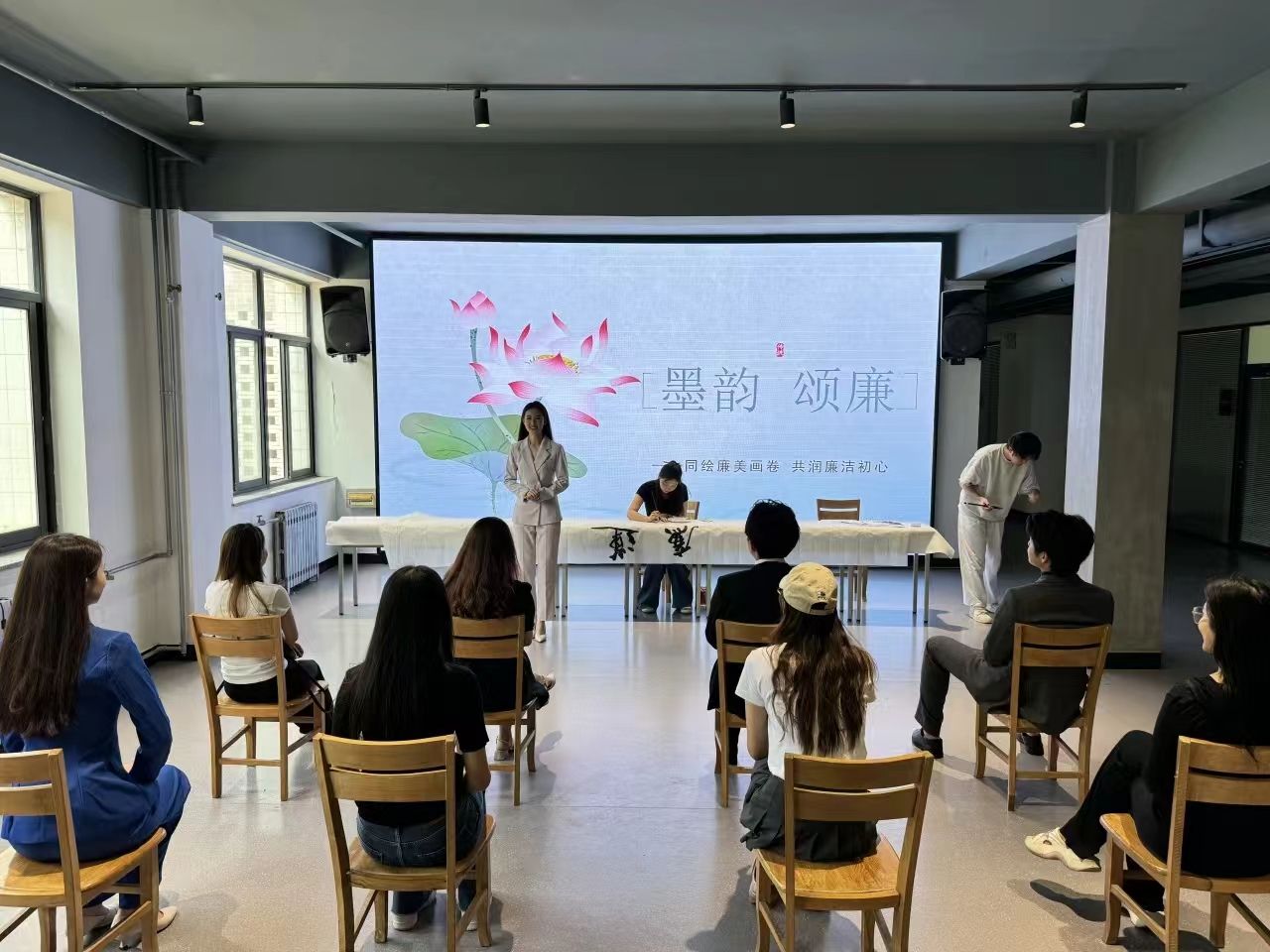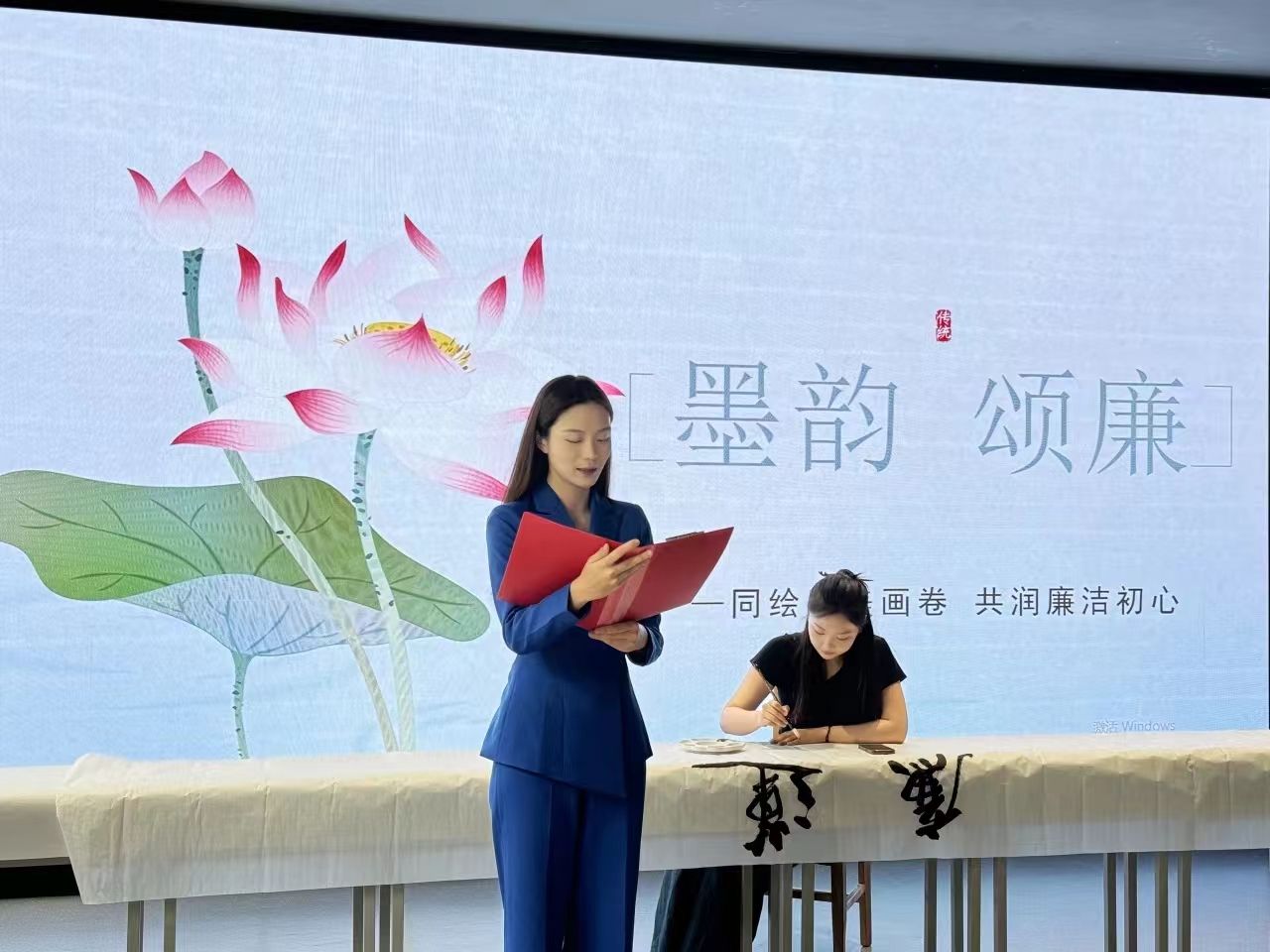 翰墨传廉韵,妙笔颂清风。活动中,教师代表张骁将与员工代表一起挥毫泼墨,以笔为媒,以“莲”喻“廉”,画“莲”话“廉”。同时,在书香墨韵中,员工代表以声为媒,以朗诵的方式歌颂“廉洁公正、立朝刚毅、不附权贵、铁面无私、英明决断、敢于替百姓申不平”的包公精神,“亲民爱民、艰苦奋斗、科学求实、迎难而上、无私奉献”的焦裕禄精神,“有理想信念、道德情操、育人智慧、躬耕态度、仁爱之心、弘道追求”的教育家精神。