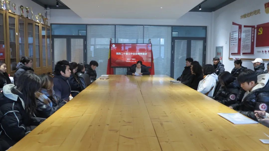9月20日,三亿体育团总支书记兼学工办主任郝荣华面向团的干部开展党的二十届三中全会精神宣讲。她强调,作为团的干部要对全会精神先学一步、学深一层,示范、带动广大团员青年积极贯彻落实全会精神,以青春力量为进一步全面深化改革、推进中国式现代化挺膺担当。