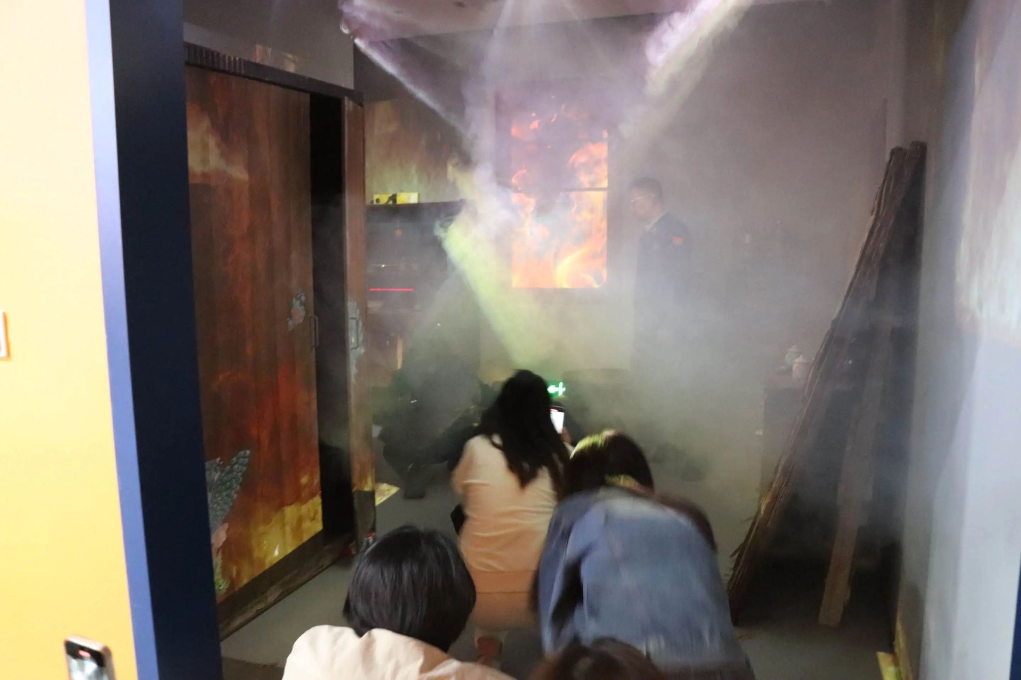 模拟救援环节,党员师生参与智能化灭火器选择模拟训练,体验穿越浓烟走廊实践“低姿贴墙”逃生法,感受高层缓降器速降,将理论知识与实践操作紧密结合,实现党性修养与应急技能双提升。