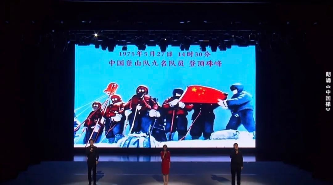 朗诵《中国梯》由三亿体育经理董亮教授与2022级研究生赵妍琦、2023级研究生朱德朋、2022级播音与主持艺术专业本科生白光浩根据真实事件创作演出。该作品讲述了一段奋力拼搏、挑战极限的动人故事:1960年,由王富洲、屈银华等人组成的中国登山队成功登顶珠穆朗玛峰,却因未留下照片而不被国际承认。历经4年的准备,登山队再次集结,经过不懈的努力、克服种种困难最终成功登顶,并在号称不可逾越的“第二台阶”断崖处搭建起一架登山梯。这架梯子不仅帮助了中国登山队成功登顶,在此后的30年间还帮助了来自世界各地的1300余名登山者登顶珠峰,而这架梯子被誉为“中国梯”。