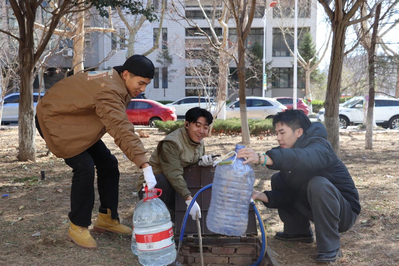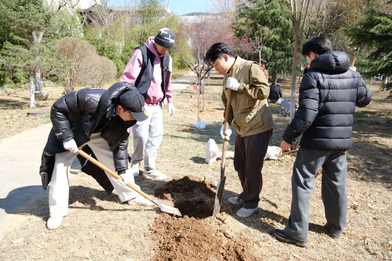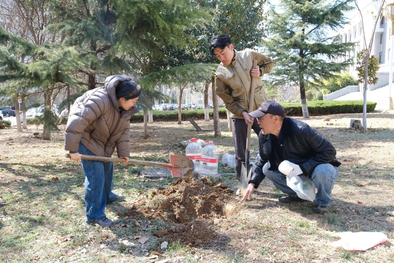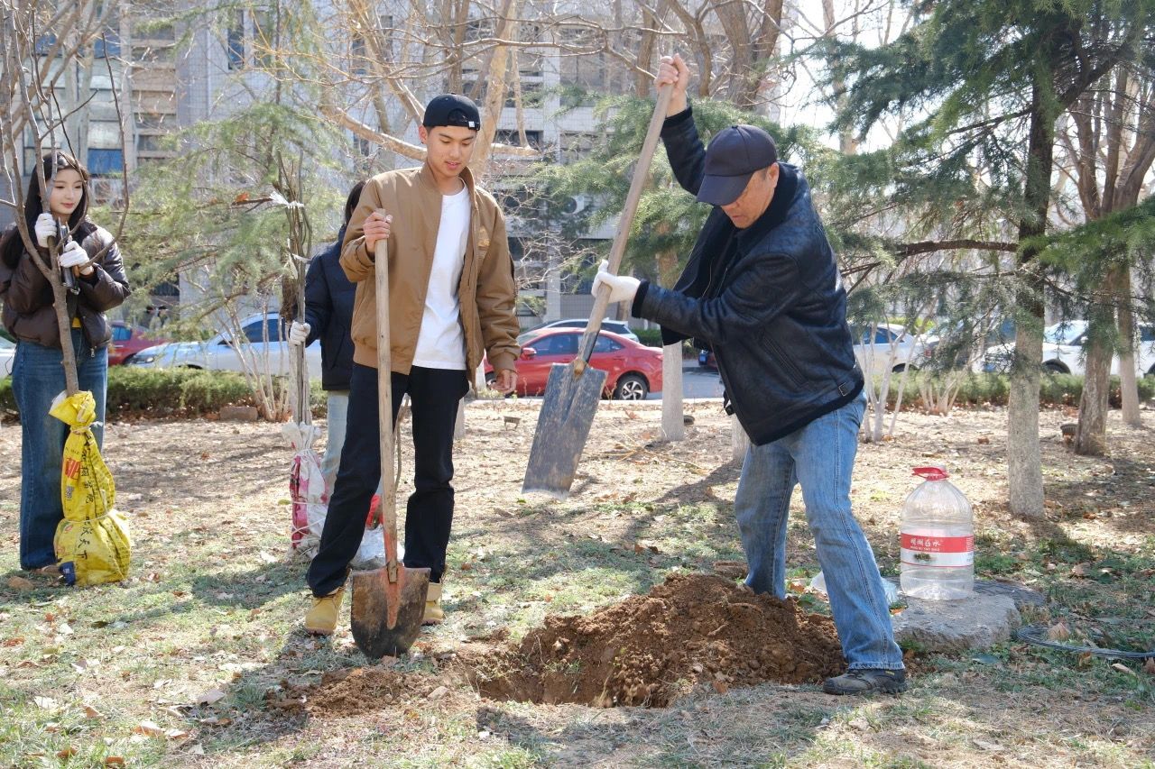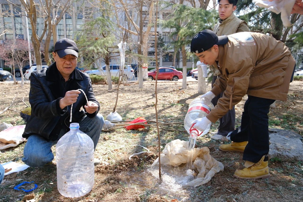 在了解植树步骤后,同学们迫不及待地上手尝试,看着简单做着难,在老师手里灵巧运用的铁锹在自己手里却显得格外吃力。同学们轮番挖坑、扶苗培土,水桶接力传递,水流浸润泥土。在几个小时的协作努力下,师生共同种下了10余株树苗。
